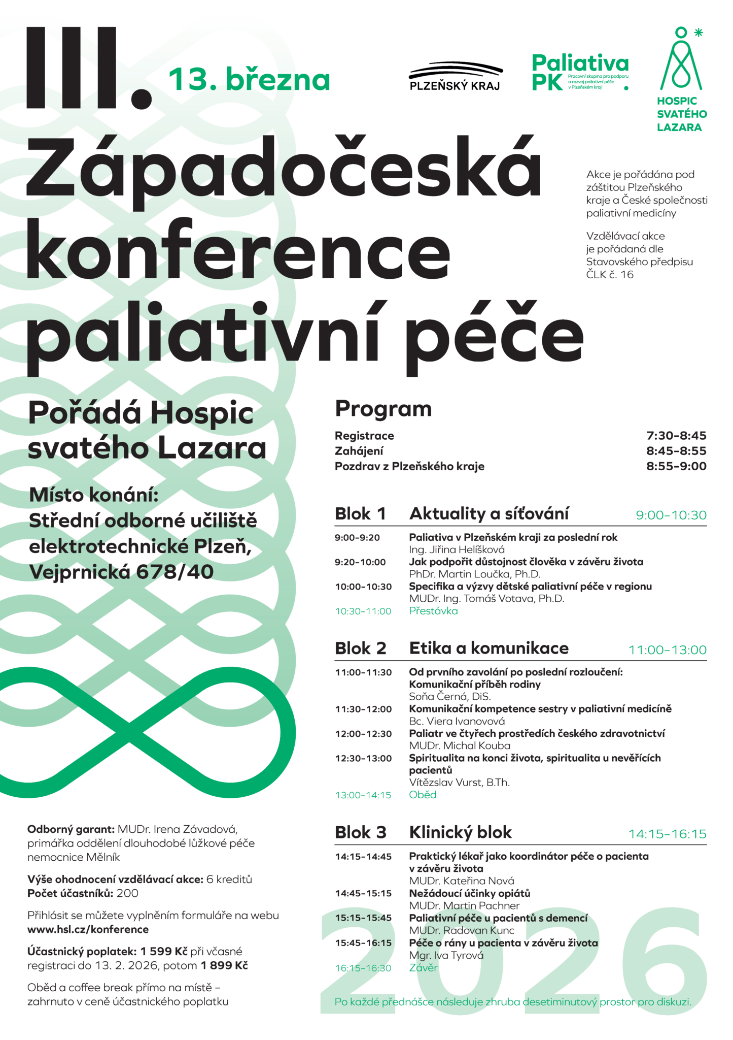 Ve pátek 13. března 2025 od 7:30 do 16:30 pořádáme v pořadí již III. Západočeskou konferenci paliativní péče v prostorech víceúčelového sálu Středního odborného učiliště elektrotechnického v Plzni.